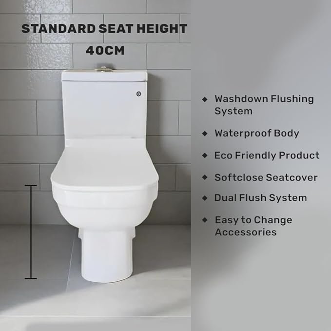 The 105 – EUROPA One-Piece Toilet by Gronza Ceramica is crafted to bring elegance and functionality together. Measuring 695 x 355 x 725mm, this toilet is ideal for both residential and commercial bathroom spaces where space efficiency meets style. Its seamless one-piece design offers easy cleaning, a modern look, and greater hygiene compared to traditional two-piece toilets.